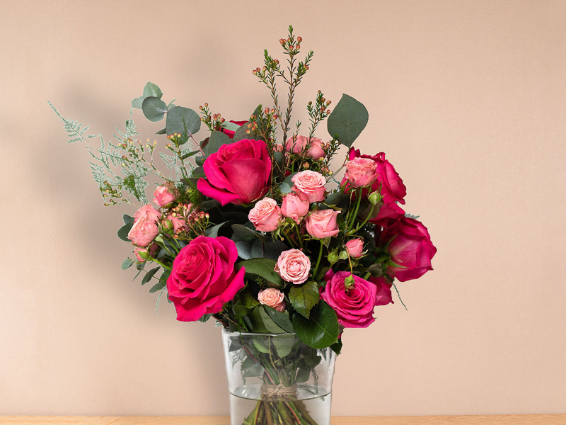 Lieflijk boeket met onder andere roze rozen en andere roze bloemen.